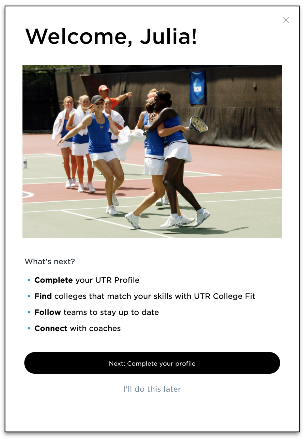 Step 6: You'll be prompted to answer the Get Rated questionnaire/s to populate the child's Estimated Universal Tennis Rating (UTR rating) and/or UTR Pickleball rating. The estimated UTR rating will be a provisional rating and will automatically update into a UTR rating once the player starts adding matches to the profile. Note: You can skip this step by clicking "I'll do this later" below the Continue button.