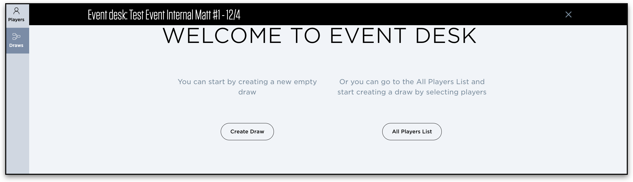 To get started, select the "Event Desk" button on your event page. Note: The Event Desk button will appear after the registration has been closed. If no existing draws, you'll be prompted to choose how you like to schedule your matches.
