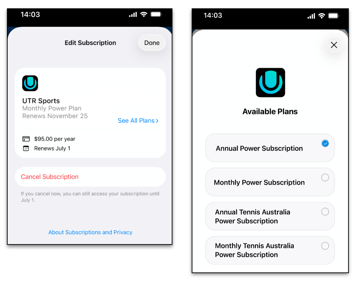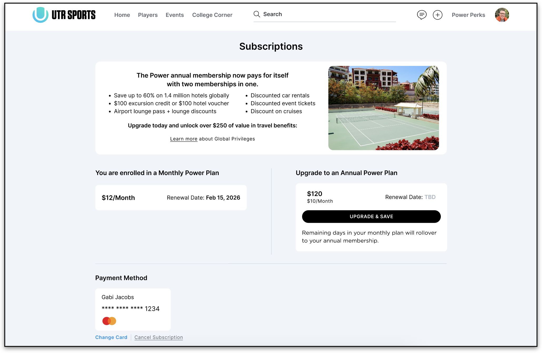 This article explains how to update your Power Player subscription, including updating billing information and upgrading plans using either the UTR Sports web or the iOS app.