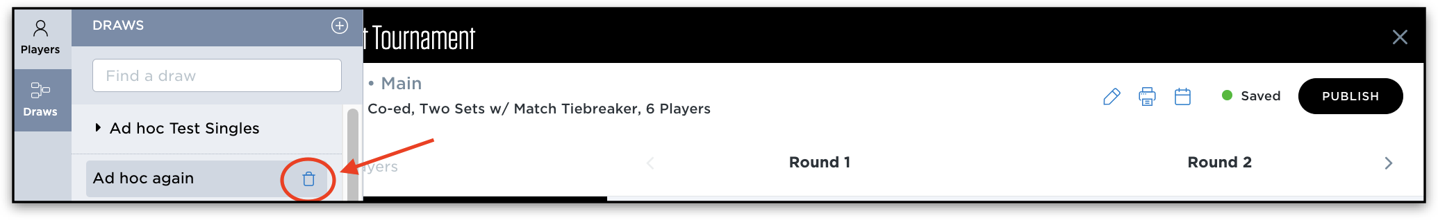 To delete a draw, select the trash can icon next to the draw name on the left side panel. Draws can only be deleted if no scores have been entered into that draw. The trash icon will not populate to draws with scores entered.
