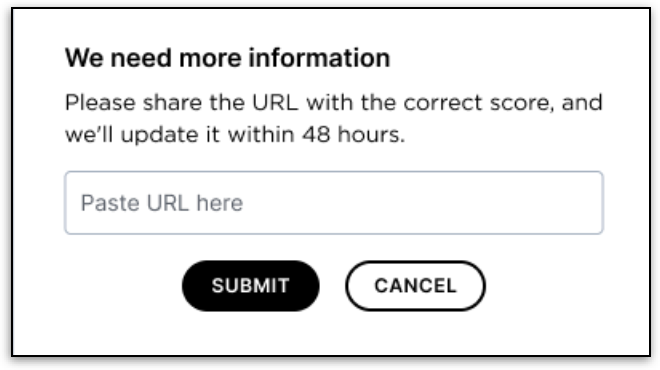 Note: A prompt will appear asking you to provide a URL where the correct score can be verified. This could be a link to an official tournament page, results page, or screenshot hosted online.