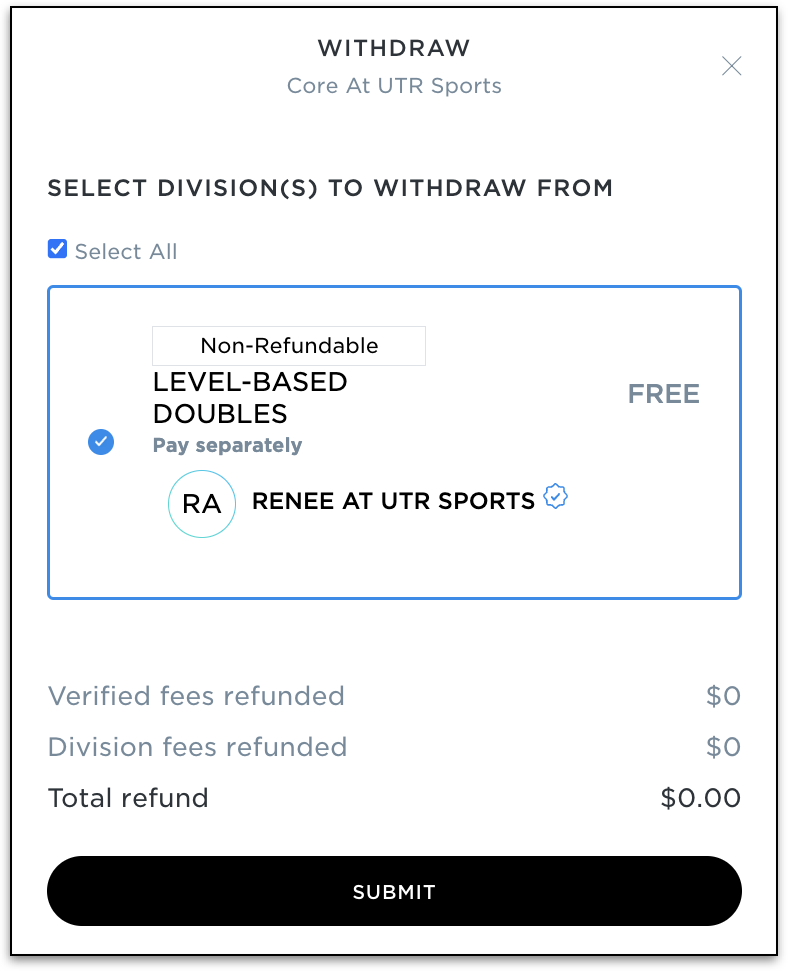 Refunds for Player entry fees will only be issued if you withdraw from all divisions at once. For example, if you're registered in three divisions, you must withdraw from all three to receive a refund.
