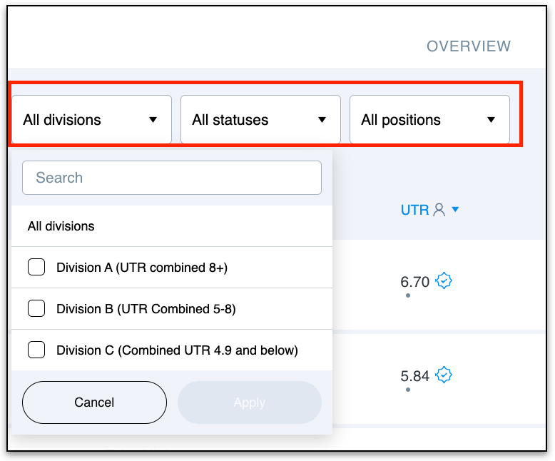 - Division – View only players in a specific division.