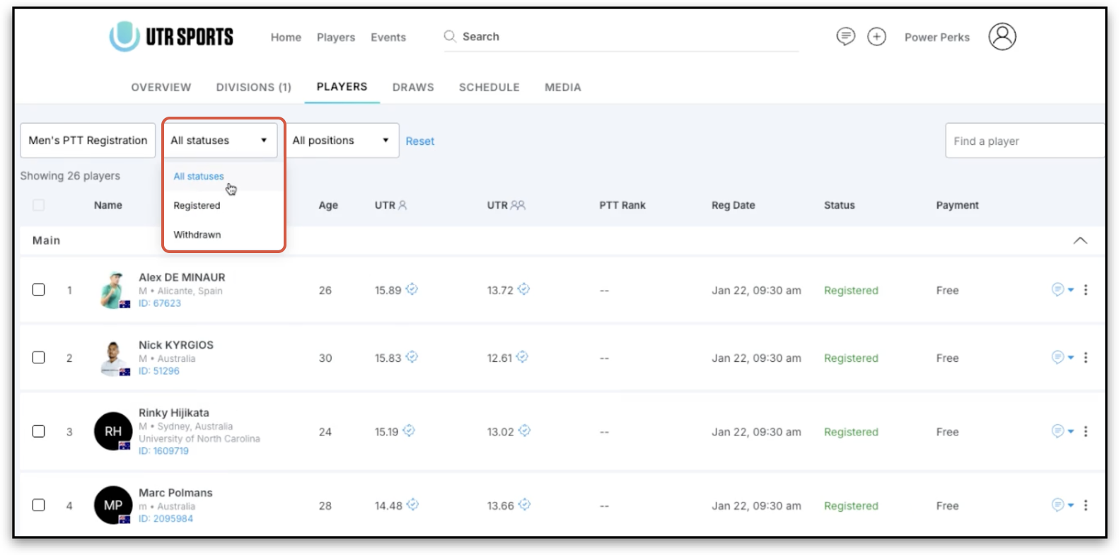 - Registration Status – Identify players with pending registrations.